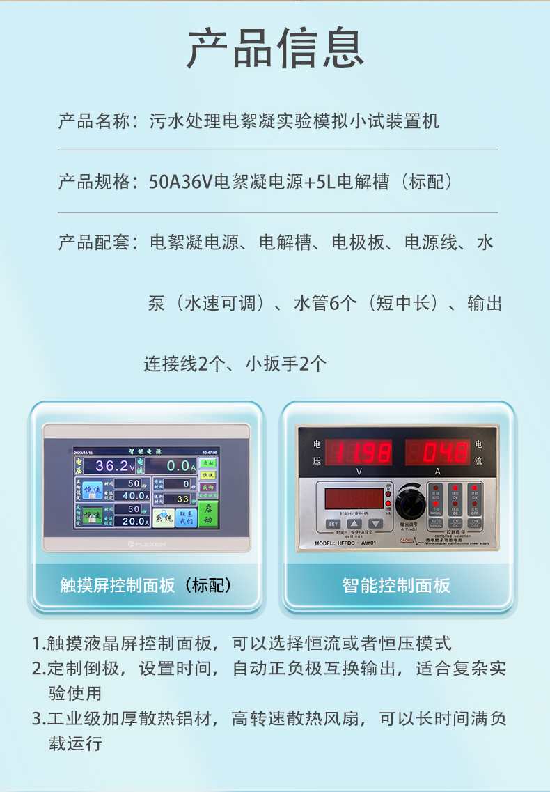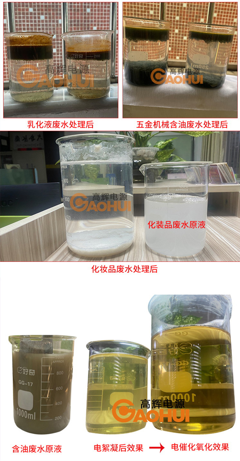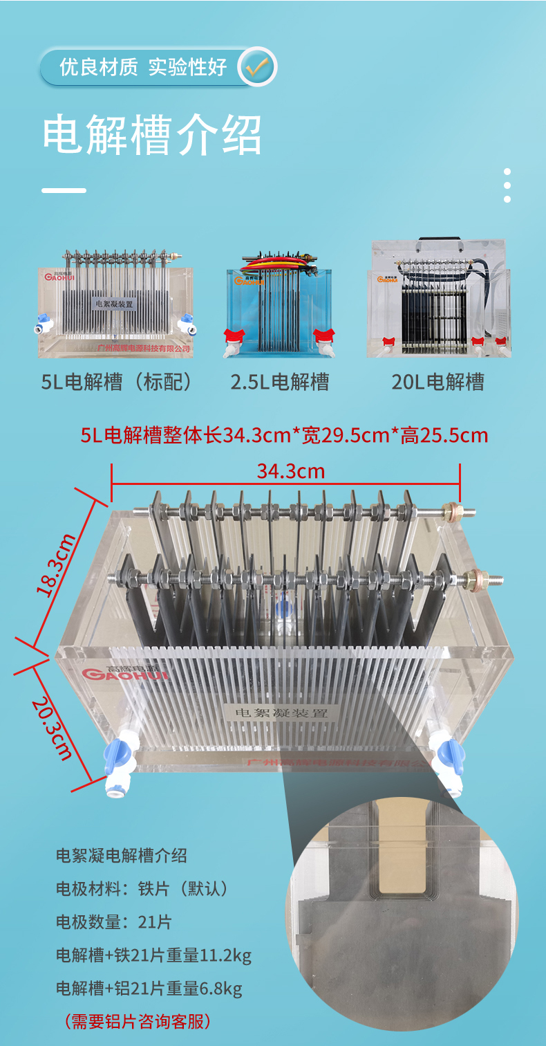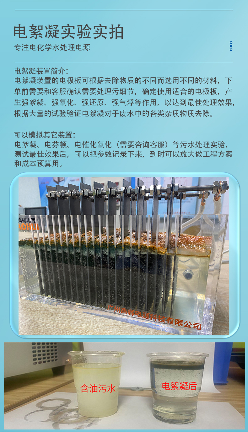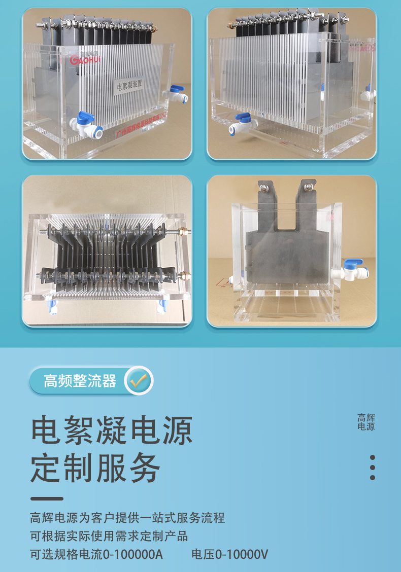 實(shí)驗(yàn)裝置主要是由50A36V電絮凝電源+電解糟+電極板+水泵(水速可調(diào))和其它線材組成。電源采用的是輸入220V輸出標(biāo)配電源輸出50A36V污水處理電源。