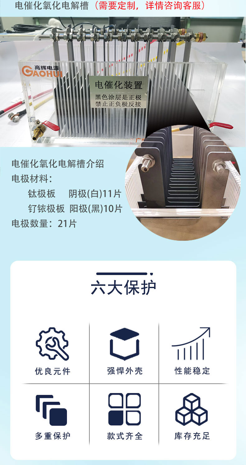 實驗裝置主要是由50A36V電催化氧化電源+電解糟+電極板+水泵(水速可調)和其它線材組成。電源采用的是輸入220V輸出標配電源輸出50A36V污水處理電源。