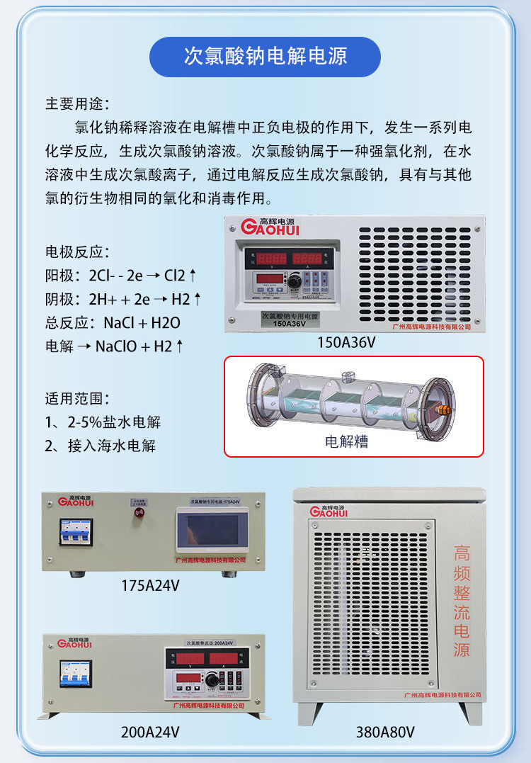氯化鈉稀釋溶液在電解槽中正負電極的作用下,發(fā)生一系列電化學(xué)反應(yīng),生成次氯酸鈉溶液。次氯酸鈉屬于一種強氧化劑,在水溶液中生成次氯酸離子,通過電解反應(yīng)生成次氯酸鈉,具有與其他氯的衍生物相同的氧化和消毒作用。