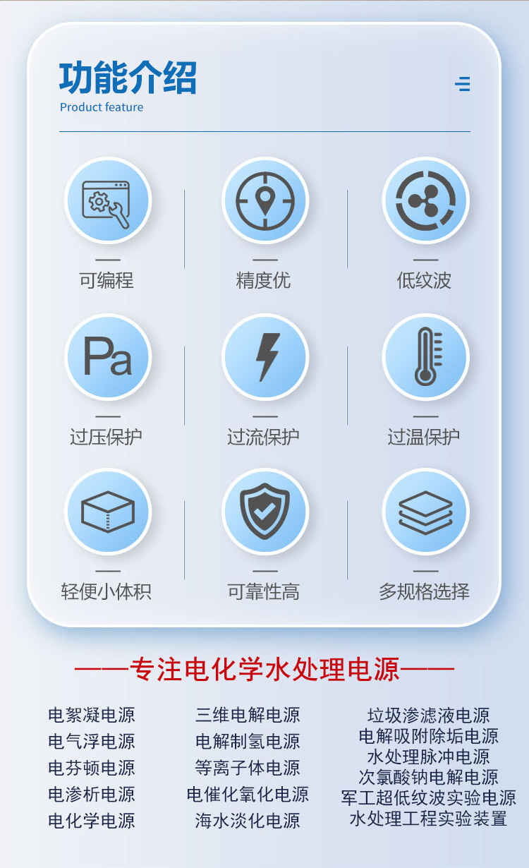 適合于水處理電解、電絮凝、電催化氧化、電滲析、電芬頓、水提取金屬、污水處理、海水淡化、次氯酸鈉電解、電解除垢等多種領(lǐng)域。