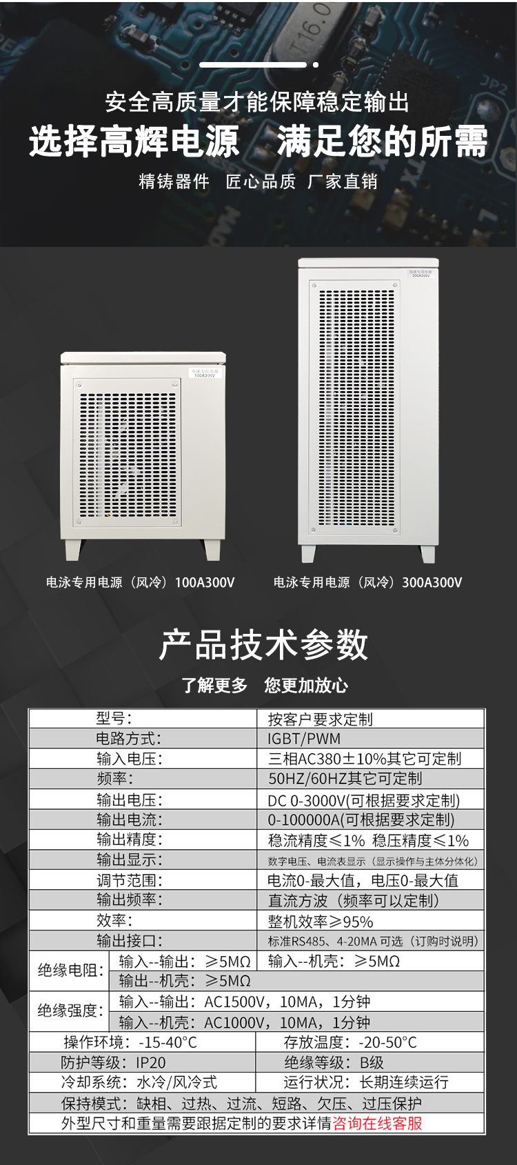主要用途:汽車車身、摩托車、自行車、航空、建材、家電、金屬殼體、鐵材電泳等等各種金屬材料的陰陽(yáng)極電泳涂漆,電泳涂漆生產(chǎn)線及相似技術(shù)要求的整流電源場(chǎng)合。