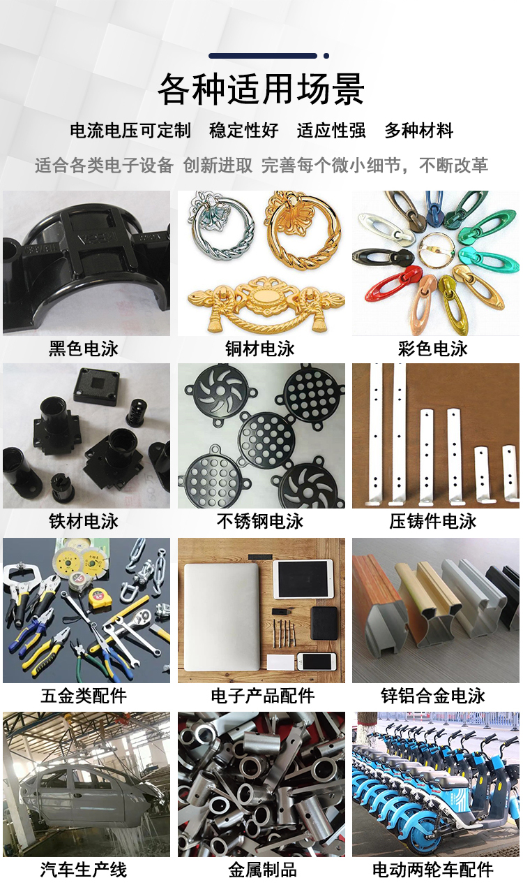 7、電泳工藝的特點(diǎn):當(dāng)然電泳由其沉積機(jī)理決定,它目前只能用于鋼鐵零件,它顏色僅局限于黑色,色調(diào)較單一,因此通常僅作為底漆使用。